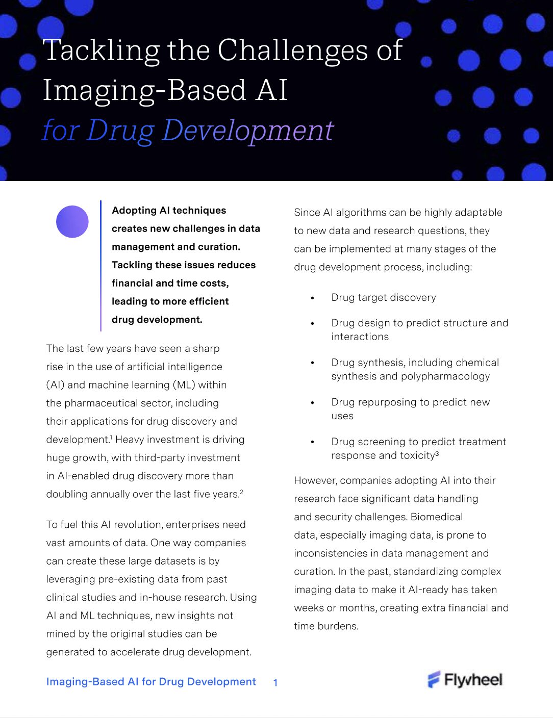 This white paper explores the crucial role of artificial intelligence (AI) in revolutionizing the pharmaceutical sector. The paper delves into the unique challenges faced in handling and curating large volumes of imaging data for AI research and how to address these obstacles. By streamlining workflows, ensuring secure data management, and offering collaborative support, Flywheel empowers researchers to accelerate drug development and unlock valuable insights from existing data. This white paper is essential reading for pharmaceutical professionals seeking to leverage AI effectively, streamline processes, and drive innovation in drug discovery and development.